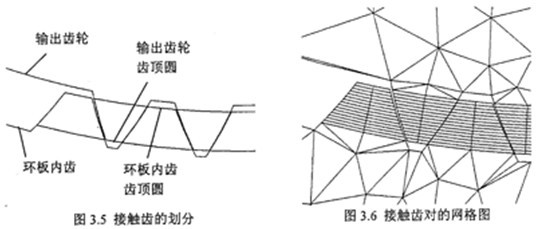 因為在少齒差內嚙合中,不處于嚙合位置的齒對在進入嚙合之前以及在脫離嚙合之后,其內、外齒廓間的間隙非常小,因此雙環減速器環板內齒輪嚙合傳動在載荷作用下,因彈性變形實際接觸齒對數遠大于理論重合度,在傳遞載荷的過程中,輪齒的變形量要大于一部分齒對的間隙,這些齒對就要接觸并同時分擔載荷,這就大大提高了整個齒輪傳動裝置的承載能力。同時實際齒輪的接觸對數及接觸應力,隨著載荷增大而相應增加。因而少齒差內嚙合行星齒輪傳動的實際接觸齒對數的確定,對齒輪承載能力的估算以及齒輪模數的正確確定具有重要意義。對于齒輪的接觸問題的,國內外學者對此已作了不少研究,取得一些研究成果。然而這些研究有的沒有考慮誤差的影響,有的僅考慮內外嚙合齒輪副齒廓理論間隙,沒有考慮輪齒制造誤差和輪齒的彈性變形的影響。本文對于環板內齒輪接觸問題進行了計算,計算時考慮內外嚙合齒輪副齒廓理論間隙、制造誤差及輪齒彈性變形的影響,在此基礎上,建立了少齒差內嚙合行星齒輪傳動實際接觸齒對數及各齒間載荷分配的理論分析計算的實體模型,利用I-DEAS軟件進行了環板內齒輪接觸有限元計算,并用該軟件分析計算了在不同載荷工況下的實際接觸齒對數、最大接觸應力以及兩環板上各接觸齒的載荷分配情況。