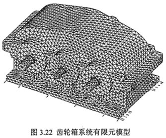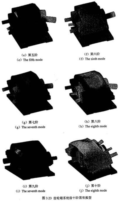如圖3.22 所示的齒輪系統有限元模型,根據實際的安裝情況,為了能比較準確地反映實際狀態,箱體的邊界條件為:箱體底座垂直方向約束,四個螺栓孔處全部固定約束。則研究齒輪系統的約束模態,表3.14~3.15分別為用I-Deas軟件的Lanczos模態求解法計算得到的各重要零部件及齒輪系統前上10階固有頻率和響應的振型情況。限于篇幅,圖3.23給出了齒輪系統的前十階固有振型。