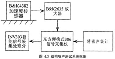 在測試產(chǎn)對所有的加速度傳感器,放大器及數(shù)據(jù)自動采集處理系統(tǒng)進行校準,對規(guī)定的所有測點進行打磨,平磨并做好標記,測試時在規(guī)定工況下依次將傳感器磁性底座放在各測點上。傳感器測得的振動信號(包括速度級和加速度級振動信號)經(jīng)電荷放大器放大后進入16通道卡式采集儀進行采集記錄,用智能動態(tài)信號分析儀分析各測點的1/3倍頻程度級結(jié)構(gòu)噪聲,再對所有的測點的結(jié)構(gòu)噪聲值做對數(shù)平均,得到總的結(jié)構(gòu)噪聲頻譜圖。空氣噪聲用聲級計測量減速裝置各個測點的A計權(quán)聲壓級和1/1倍頻程聲壓級。各測點距齒輪箱測量表面的距離為1米。測試前已用標準噪聲源HY203-93260對聲級計進行校準。測試系統(tǒng)框圖如圖6.3所示。測試設備如下:
