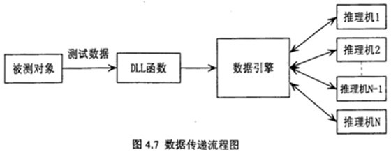 根據(jù)流程圖可知,從故障測(cè)試數(shù)據(jù)到數(shù)據(jù)引擎,有兩種數(shù)據(jù)處理方式,一種是故障測(cè)試數(shù)據(jù)由數(shù)據(jù)采集系統(tǒng)采集后,可先進(jìn)行預(yù)處理,將故障信號(hào)數(shù)據(jù)處理為推理機(jī)所需的故障特征數(shù)據(jù),然后發(fā)送出去,動(dòng)態(tài)連接庫(kù)DLL函數(shù)則通過(guò)網(wǎng)絡(luò)接收這些故障特征數(shù)據(jù),同時(shí)對(duì)照推理機(jī)向數(shù)據(jù)引擎申請(qǐng)的故障特征變量,將申請(qǐng)的故障特征變量對(duì)應(yīng)的值找出,按數(shù)據(jù)引擎規(guī)定的格式反送給申請(qǐng)數(shù)據(jù)的推理機(jī)。另一種是故障測(cè)試數(shù)據(jù)由數(shù)據(jù)采集系統(tǒng)采集后,按一定格式直接發(fā)送出去,動(dòng)態(tài)連接庫(kù)DLL函數(shù)則通過(guò)網(wǎng)絡(luò)接收這些故障信息數(shù)據(jù),然后再進(jìn)行數(shù)據(jù)預(yù)處理,將故障信息數(shù)據(jù)處理為推理機(jī)所需的故障特征數(shù)據(jù),同時(shí)對(duì)照推理機(jī)向數(shù)據(jù)引擎申請(qǐng)的故障特征變量,將申請(qǐng)的故障特征變量對(duì)應(yīng)的值找出,再按數(shù)據(jù)引擎規(guī)定的格式反送給申請(qǐng)數(shù)據(jù)的推理機(jī)。