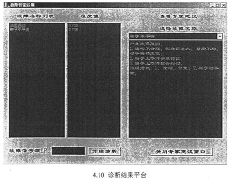 根據(jù)給出的數(shù)據(jù)端口及數(shù)據(jù)格式,即可按用戶(hù)的要求設(shè)計(jì)診斷結(jié)果輸出平臺(tái)。診斷結(jié)果應(yīng)給出診斷故障的名稱(chēng)、故障發(fā)生的部位,故障發(fā)生的時(shí)間及程度。對(duì)于不同的故障,提示故障發(fā)生的可能原因,給出相應(yīng)的專(zhuān)家建議或維修方法等。圖4.10為本文集成系統(tǒng)的診斷結(jié)果輸出用戶(hù)界面。圖4.11為本文集成系統(tǒng)的專(zhuān)家知識(shí)庫(kù)建立及診斷推理平臺(tái)。