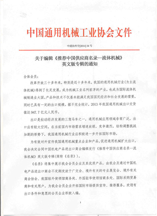 關(guān)于編輯《推薦中國供應(yīng)商名錄—流體機(jī)械》英文版專輯的通知