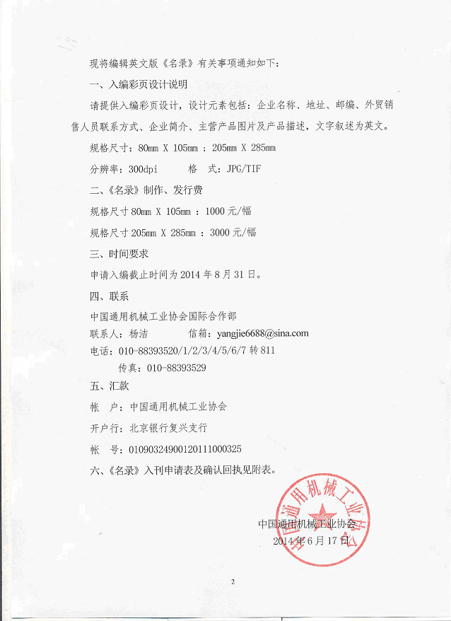 上述申請經(jīng)中國通用機(jī)械工業(yè)協(xié)會確認(rèn),即具合同效力,雙方必須履行其有關(guān)責(zé)任和義務(wù)。請收到確認(rèn)回執(zhí)后即將《名錄》制作發(fā)行費(fèi)匯入指定帳戶。