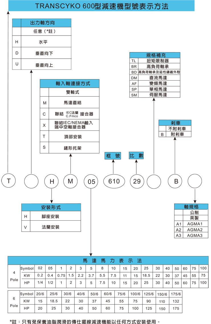 產品型號:600系列 產品描述: . 取代傳統的齒輪及蝸輪減速度馬達,適用于反復衝擊負荷,可承受500%之衝擊負荷,體積小,規格標準化。 . 可適用與AC,DC,Servo,油壓及氣壓馬達 扭力值:0.6~6000kgf.m . 可附剎車,及加裝扭力限制器 優點 高效率 擺線減速機采用滾動嚙合原理,所以減少了滑動摩擦及振動現象,在扭矩的傳送中,由多個齒來承受。其效率一段時可達92%以上,二段時效率為85%以上(一段比為87以內,二段比為7569以內)。 抗過載能力強(500%) 行星擺線齒輪采用了擺線針齒嚙合,實現了多齒同時嚙合傳動的能力,最高達67%,且避免了斷齒的可能,所以擺線針齒結構具有其他減速機不能承受的抗過載能力500%。 600型提供了齊全的規格及比數,供應所需。一段比由1:6到1:87,二段比更可高達1:7569。馬力數由1/8馬力到200馬力,出力扭矩更可高達6000kg.m(500000in-lbs)。 可符合多樣化之安裝方式及采用立式、臥式、IEC/NEMA、空油壓或伺服馬達。針齒殼材質可采用高品質延展性鑄鐵,來加強它的堅韌性。動力傳動嚙合件使用軸承鋼材質,經淬火、回火后,精密研磨而成,其硬度達HRc59-62度。 擺線針輪結構使其成為小巧、高效率的減速機。雖然它外型小巧,但是扭矩和受力決不輸給其它減速機,其具有以下特色: 低噪音及振動 與傳統滑動嚙合相比較,擺線滾動嚙合大大降低了噪音及振動 600型擺線減速機皆控制在優良的公差范圍內及低慣性矩,故極適合用于正逆轉及啟動頻繁的地方。