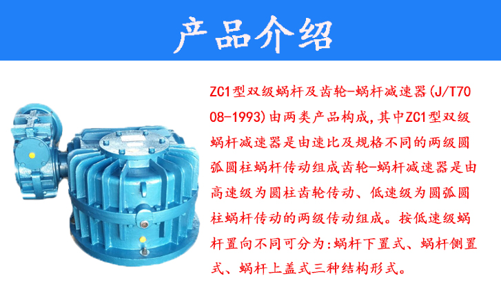 ZC1型雙級蝸桿及齒輪-蝸桿減速器(J/T7008-1993)由兩類產品構成,其中ZC1型雙級蝸桿減速器是由速比及規格不同的兩級圓弧圓柱蝸桿傳動組成齒輪-蝸桿減速器是由高速級為圓柱齒輪傳動、低速級為圓弧圓柱蝸桿傳動的兩級傳動組成。按低速級蝸桿置向不同可分為:蝸桿下置式、蝸桿側置式、蝸桿上蓋式三種結構形式。