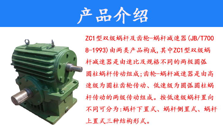 ZC1型雙級蝸桿及齒輪-蝸桿減速器(JB/T7008-1993)由兩類產品構成,其中ZC1型雙級蝸桿減速器是由速比及規格不同的兩極圓弧圓柱蝸桿傳動組成;齒輪-蝸桿減速器是由高速級為圓柱齒輪傳動、低速級為圓弧圓柱蝸桿傳動的兩級傳動組成。