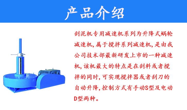 刮泥機專用減速機系列為升降式蝸輪減速機,屬于攪拌系列減速機,是由我公司技術部最新研發上市的一種減速機,該機最大的特點是在刮料或者攪拌的同時,可實現攪拌器或者刮刀的自動升降,控制方式有手動S型及電動D型兩種。