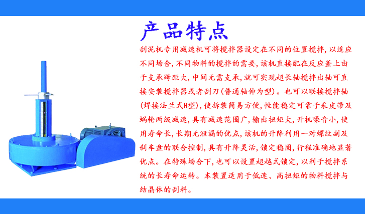 刮泥機專用減速機可將攪拌器設定在不同的位置攪拌,以適應不同場合,不同物料的攪拌的需要,該機直接配在反應釜上由于支承跨距大,中間無需支承,就可實現超長軸攪拌出軸可直接安裝攪拌器或者刮刀(普通軸伸為型)。也可以聯接攪拌軸(焊接法蘭式H型),使拆裝簡易方便,性能穩定可靠于采皮帶及蝸輪兩級減速,具有減速范圍廣,輸出扭矩大,開機噪音小,使用壽命長,長期無泄漏的優點,該機的升降利用一對螺紋副及剎車盤的聯合控制,具有升降靈活,鎖定穩固,行程準確地顯著優點。在特殊場合下,也可以設置超越式鎖定,以利于攪拌系統的長壽命運轉。本裝置適用于低速、高扭矩的物料攪拌與結晶體的刮料。