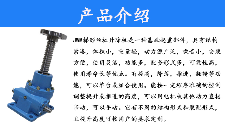 JWM梯形絲杠升降機是一種基礎起重部件,具有結構緊湊、體積小、重量輕、動力源廣泛、無噪音、安裝方便、使用靈活、功能多、配套形式多、可靠性高、使用壽命長等許多優點?梢詥闻_或組合使用,能按一定程序準確地控制調整提升或推進的高度,也可以用電動機或其它動力直接帶動,也可以手動。它有不同的結構形式和裝配形式,且提升高度可按用戶的要求定制。