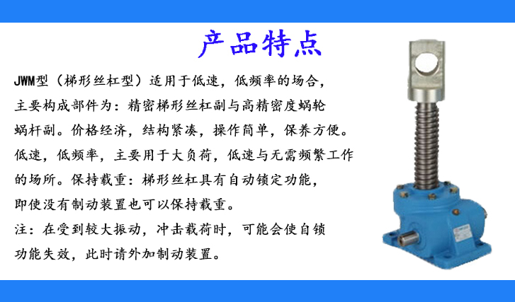 1、JWM型(梯形絲杠型)適用于低速、低頻率的場合,主要構成部件為:精密梯形絲杠副與高精密度蝸輪蝸桿副。