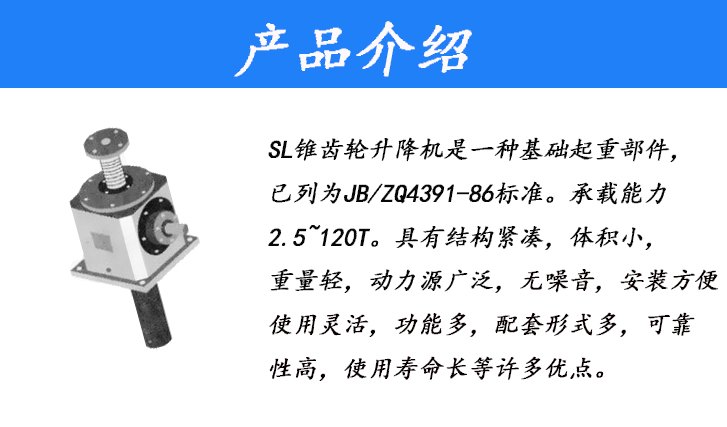 SL錐齒輪升降機是一種基礎起重部件,已列為JBZQ4391-86標準。承載能力2.5~120T。具有結構緊湊、體積小、重量輕、動力源廣泛、無噪音、安裝方便、使用靈活、功能多、配套形式多,可靠性高、使用壽命長等許多優點。