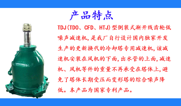 TDJ(TDO、CFD、HTJ)型倒裝式漸開線齒輪低噪聲減速機,是我廠自行設計國內獨家開發生產的更新換代的冷卻塔專用減速機,該減速機安裝在風機的下面,出水管的上面,減速機、風機等件的重量不再承受在塔體上,避免了塔體長期受壓而變形塔的綜合噪聲降低。本產品為國家專利產品。