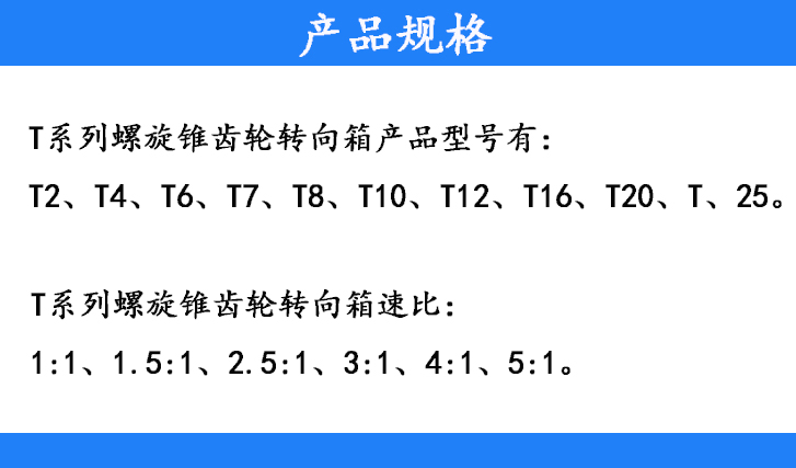 T系列螺旋錐齒輪轉向箱產品型號:T2、T4、T6、T7、T8、T10、T12、T16、T20、T25