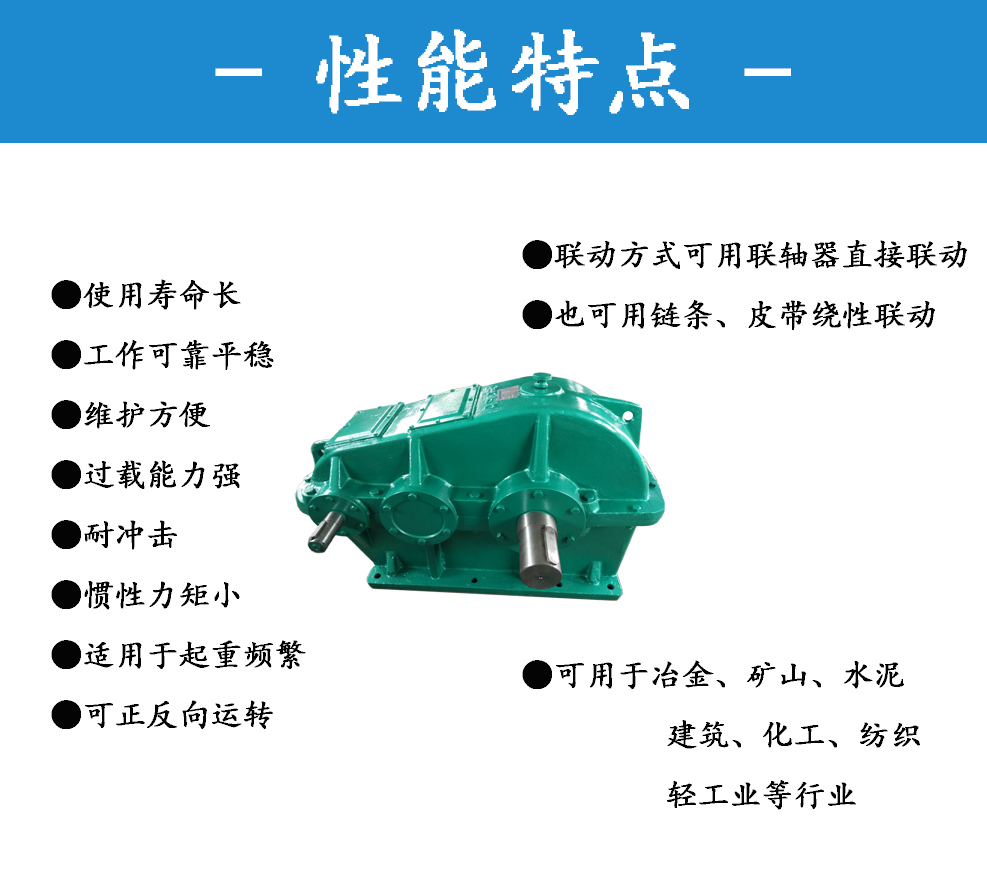 該系列齒輪減速機使用壽命長,工作可靠,維護方便。本機還具有過載能力強,耐沖擊、慣性力矩小,適用于起重頻繁和正、反向運轉的特點。其聯動方式可用聯軸器直接聯動,也可用鏈條、皮帶撓性聯動主要用于冶金、礦山、水泥、建筑、化工、紡織、輕工業等行業。