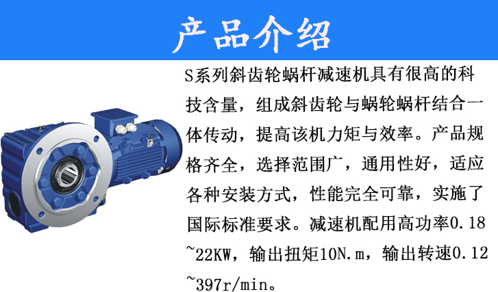 S系列齒輪蝸桿減速電機具有很高的科技含量,有斜齒輪與蝸輪蝸桿結合一體傳動,提高該機力矩與效率。該系列產品規格齊全,轉速范圍廣,通用性好,適應各種安裝方式,性能安全可靠壽命長,實施了國際標準要求。減速機配用高功率0.18~22KW,輸出轉距10N.m~4890N.m,輸出轉速.12~397r/min。