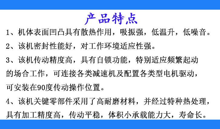 3、該機傳動精度高,特別適應在有頻繁啟動的場合工作,可連接各類減速機及配置各類型電機驅動,可安裝在90°傳動操作位置。