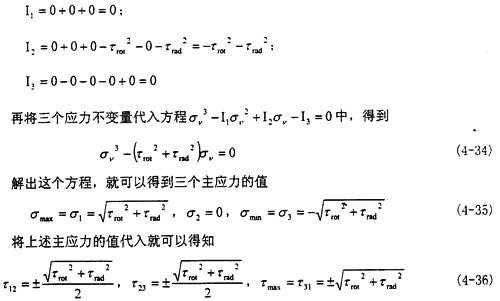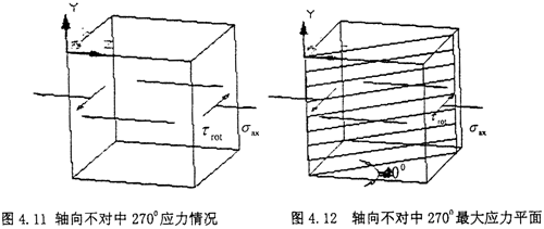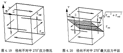 此時的受力由圖上可以看出,屬于空間應力狀態,其基本分析過程類似于徑向不對中900狀態,現在將徑向不對中2700時的受力情況:σxx=0,σyy=0,σzz=0,τxy=-τrot,σyz=0,σzx=0,σzx=τrod分別代入式(4-29)(4-30)(4-31),得到