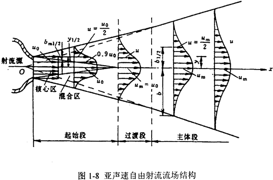 亞聲速自由射流在形成穩定的流動形態后,整個射流可劃分為幾個區段:由噴口邊界起向內外擴展的紊動摻混部分為紊動剪切層混合區;中心部分未受摻混影響,保持原來出口流速,稱為核心區,出口至核心區末端的一段稱為射流的起始段。紊動充分發展以后的部分稱為射流的主體段。主體段與起始段之間的區域稱為過渡段。