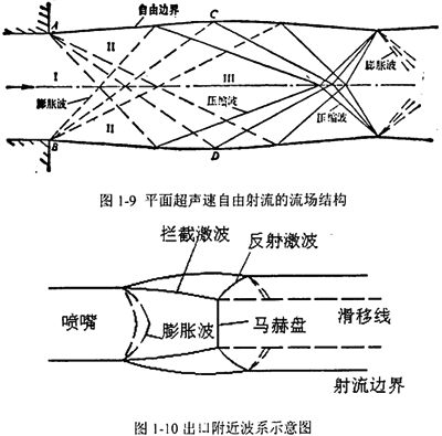 對于圖1-9所示的欠膨脹超聲速自由射流,當射擊流從出口射入靜止大氣中的時候,由于出口截面上的射流的靜壓p1大于環境壓力pa,在裂尖的邊緣將發出兩族膨脹波,這兩族膨脹波在中心流線相交,氣體經過膨脹波使靜壓由p1降到pa,經膨脹波后氣流,其自由邊界向外擴張。兩族膨脹波相交之后互相穿過,并保持為膨脹波。這些膨脹波在自由邊界反射回來形成兩族壓縮波,并使氣流邊界向內收縮。這兩族壓縮波相互穿過并在自由邊界上反射回膨脹波,這種波的相交與反射現象不斷地進行下去,逐漸衰減。