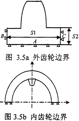 對于外齒輪Daimler-Benz公司選取邊界的方法是先取半個齒輪進行有限無計算,這是從整體來考慮問題,然后根據計算的結果來選擇邊界的范圍,其所定的邊界寬度如圖3.5a,S1=6.1m,m是齒輪的模數。Chaber所取的邊界的方法是考慮圣維需原理,其所定的邊界深度為S2=1.5m。綜合以上兩者的研究,用有限無計算外齒的變形,計算模型的邊界范圍可取: