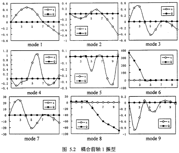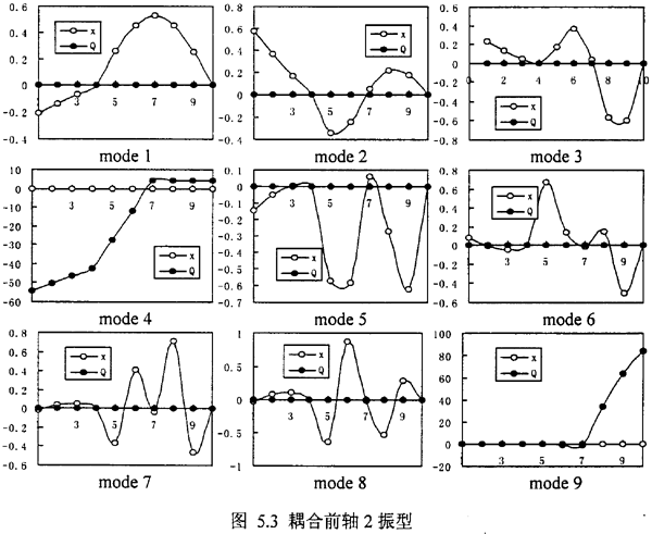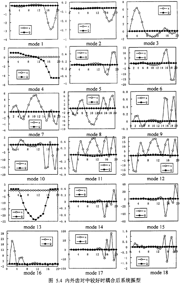 但是,另外我們可以發(fā)現(xiàn),在表5.3中出現(xiàn)了許多表5.1和表5.2中所沒有的新的固有頻率如λ4co,λ7co,λ8co,λ11co,λ12co,λ13co,觀察這些因有頻率所對(duì)應(yīng)的振型,可以發(fā)現(xiàn),它們對(duì)應(yīng)又可分為三種,1.純的彎曲耦合振型λ7co,λ8co對(duì)應(yīng)振型圖5.4中mode7、8;2.純的扭轉(zhuǎn)耦合振型λ4co,λ13co對(duì)應(yīng)振型圖5.4中mode4、13;3.彎扭振型相迭加的復(fù)振型——彎扭耦合振型λ11co,λ12co對(duì)應(yīng)振型圖5.4中mode11、12。這種彎耦合振型是由于齒輪聯(lián)軸器的耦合作用而新產(chǎn)生的,這是齒輪軸系統(tǒng)區(qū)別于一般單轉(zhuǎn)子系統(tǒng)的重要特征之一,由于彎扭耦合模態(tài)的產(chǎn)生,決定了軸系統(tǒng)的振動(dòng)是彎扭耦合振動(dòng)。