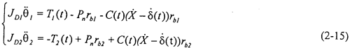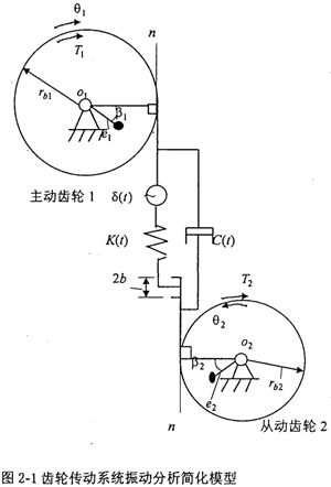 圖2-1中,rb1——主動齒輪基圓半徑;rb2——從動齒輪基圓半徑;K(t)——齒輪嚙合剛度;e1——主動齒輪偏心距;e2——從動齒輪偏心距;β1——主動齒輪不平衡質量的初始角度;β2——從動齒輪不平衡質量的初始角度;δ(t)——齒輪的綜合誤差;JD1——主動齒輪轉動慣量;JD2——從動齒輪轉動慣量;C(t)——齒輪阻尼系數;b——齒側間隙;n-n——齒輪嚙合線方向。