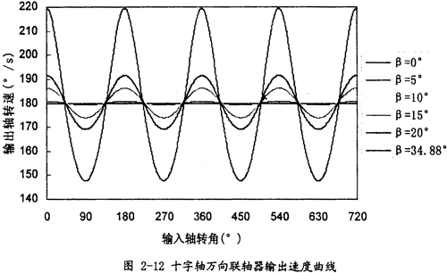 十字軸萬向聯軸器的基本結構如圖2-11所示,它是由兩個在軸上的叉形接頭1、2和一個十字軸組成,因為叉形接頭和十字軸是鉸接的,因此允許被聯接兩軸有較大的角偏斜,但兩軸不在同一軸線上時,主動軸等速運動,從動軸將在某一范圍內作周期的變速運動,即兩軸不同步。