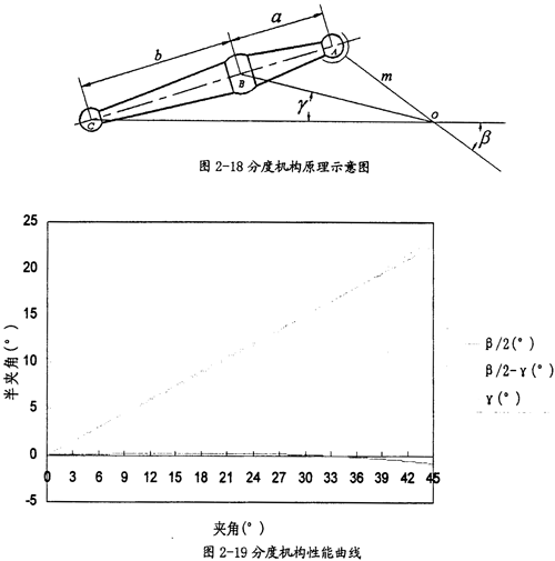 ,γ的函數圖形,在β角小于36度以前,幾乎是重疊的,在36度以后,才開始有明顯的差異,這一點從它們的差值曲線(圖2-19中下面的紫紅色曲線)也可以看出。這就是說,此機構在目前的尺度下在36度以前,它的分度性能是相當理想的,值得借鑒。不過從分度性能曲線上,可以看出,環叉式萬向聯軸器并非是完全的等角速萬向聯軸器,因為在36度以前的分度也有微小的差異。