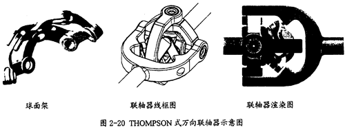 將環叉式萬向聯軸器的中間直線分度桿轉變為球面分度機構,就成為一種新型的等角速萬向聯軸器,這就是THOMPSON式萬向聯軸器其結構如圖2-20所示。