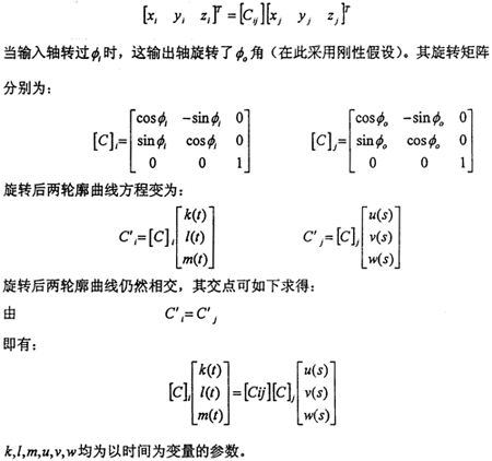 設兩曲線的交點M(嚙合點)與兩軸的交點O的連線OM與輸入軸(Zi軸的負半軸)的夾角和OM與輸出軸和夾角分別為:(在此處|OM|=