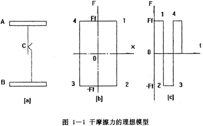 雙線性模型是非線性遲滯系統模型中最簡單的一種,而且也是最為久遠的模型,對于它的初始機理研究最早可追溯到三十年代的Deo Hartog,他在研究干摩擦時提出了干磨擦的理想模型,他認為在一個具有干摩擦面的單自由度系統中,干摩擦力隨相對滑移位移的關系可用一矩形來表示,如圖1-1所示。當該系統受到外力激勵發生運動時,干摩擦力總是與運動速度反向而且阻礙運動,進而耗損系統的能量,從時域的角度看,干摩擦力的波形為矩形波,Den Hartog還按能量耗散相等原理,把理想干摩擦等效成粘性阻尼。實際上干摩擦交界面,在外力小于摩擦力時,兩邊就有變形,隨著外力的增加,此變形隨之增大,這是因為交界面兩邊的物質有一定的彈性。即使兩邊有較大的滑移時,交界面上的干摩擦力仍然不是常數,而是隨振幅的增大而緩慢上升的。Earlestes等人對此作了描述,認為一旦交界面有了滑移,干摩擦的線性力不是常數(4Ffπ),而是與相對位移X有關,從Ff變到4Ff/π,表達式為