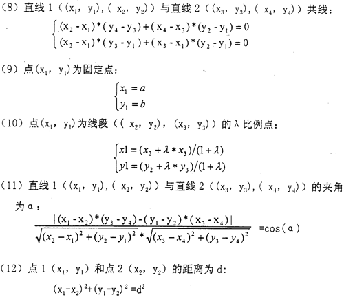 基于變量幾何法的參數設計中,約束描述方法是將其表示為代數方程組。對圖形實體的所有幾何或尺寸約束都可以表示為方程,方程中的變量是坐標點的分量。這些點一般稱為特征點。在二維圖形中,每個特征點有二個自由度,即(x,y)坐標值。用N個特征點定義的圖形共有2N個自由度。相應需要建立2N個獨立約束的方程組才能唯一確定圖形的形狀和位置。