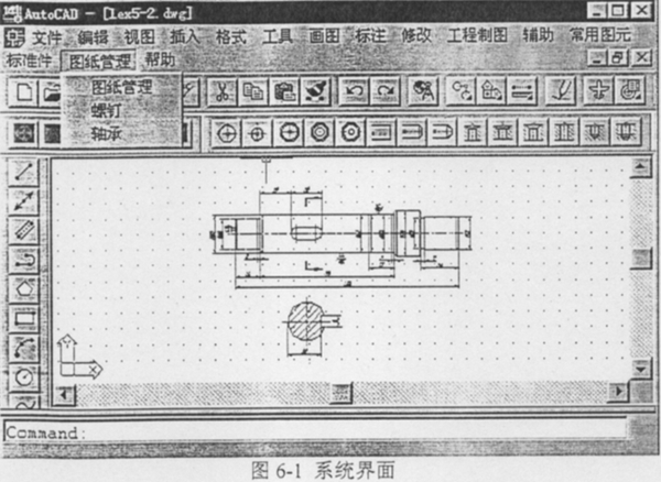 減速機(jī)計(jì)算機(jī)輔助設(shè)計(jì)、繪圖及圖紙管理系統(tǒng)主要包括MCADDS子系統(tǒng)和減速機(jī)CAD子系統(tǒng)二大部分,MCADDS系統(tǒng)是一個(gè)相對(duì)通用的圖形設(shè)計(jì)與圖紙管理系統(tǒng),適用于各種機(jī)械產(chǎn)品,包括符合國(guó)家標(biāo)準(zhǔn)的繪圖平臺(tái)、基于事物特性表的通標(biāo)件庫(kù)和面向信息集成的圖紙管理等三個(gè)模塊;減速機(jī)CAD系統(tǒng)是針對(duì)減速機(jī)的設(shè)計(jì)計(jì)算開(kāi)發(fā)的,對(duì)零部件具有通用性,包括齒輪嚙合校核、齒輪傳動(dòng)系統(tǒng)的設(shè)計(jì)與校核。圖6-1為MCADDS系統(tǒng)界面。該系統(tǒng)的主要內(nèi)容如下: