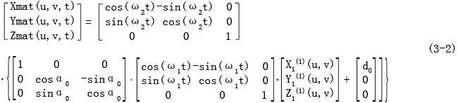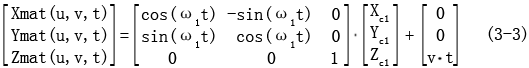 設已知接觸線為C1,它可以由三個一維數組Xc1,Yc1,Zc1表示,螺旋運動的角速度為ω,軸向移動速度為v,則由它生成的螺旋面可以用如下的坐標變換表示為: