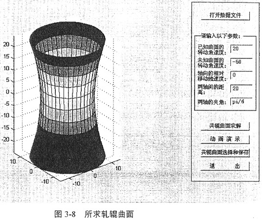 應用軟件Conjugater1.0求解軋輥曲面:已知軋件曲面是圓柱面,輸入表達式或各節點坐標值后,可以顯示其曲面形狀如圖3-6所示;根據各節點值以及輸入的運動和相對位置參數,進行共軛曲面求解運算,可以得到與已知曲面共軛的兩個曲面如圖3-7所示,這兩個曲面都滿足共軛條件的;根據實際需要,取與已知曲面外共軛的共軛曲面(如圖3-8),這就是滿足條件的軋輥曲面。