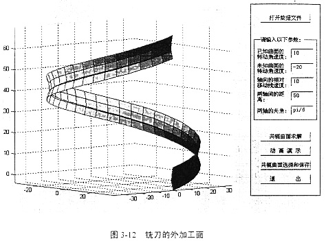 借助于軟件Conjugater1.0求銑刀加工的過程與求解軋輥曲面的過程相同。輸入輸出界面和結果如圖3-10、圖3-11、圖3-12、圖3-13所示。最后得到如圖的兩個螺旋面,這兩個螺旋面都是滿足共軛條件的,圖3-12表示銑刀在工件實體的外圓加工所得的曲面,圖3-13表示銑刀在工件的內壁加工所得的曲面。應用時可根據實際情況選取。