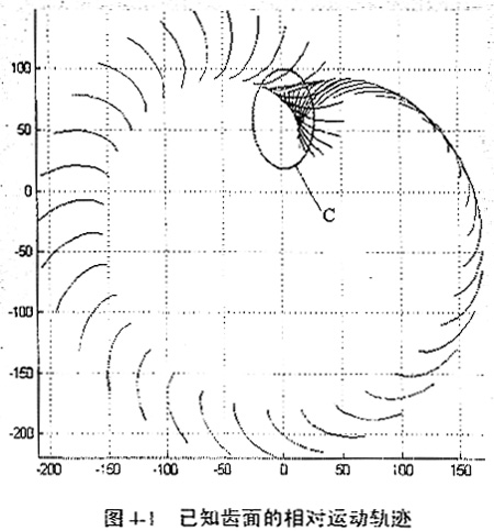 在已知齒輪齒面一個周期的相對運動所留下的運動軌跡中,我們可以看出,在區域C中出現了一個清晰的包絡面,它就是所求的未知齒面,即兩齒面在C區嚙合,稱C區為嚙合區,而在C區之外,也會出現包絡,但那只是幾何意義上的共軛點,不產生真正意義上的嚙合傳動;已知齒面在嚙合區域與非嚙合區域有較清晰的界限;在嚙合區域,已知曲面與所求齒面的共軛關系是簡單的,無論是否會出現二次接觸,這一區域的共軛曲面都可以用數字化共軛曲面求解方法求出。