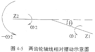 設兩齒輪的軸線分別為z1,z2,與之固連的坐標系分別為S1,S2,轉動角速度分別為ω1,ω2,兩軸線交角為θ。現暫不考慮兩齒輪的嚙合運動,只考察兩齒輪的相對擺動,為使z2固定不動,可假設給系統添加一個繞z2軸且與ω2大小相同、方向相反的運動,如圖4-5所示。則與齒輪固連的坐標系S1相對于S2的運動可以描述為繞z1軸的自轉與繞z2軸的公轉。
