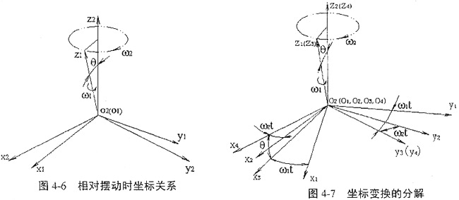 因圖4-6所示的兩坐標系的關系相對較復雜,為便于進行空間坐標變換的計算,可將變換S1→S2分解為S1→S3→S4→S2。如果規定從旋轉軸的正向看下去逆時針旋轉方向為正,順時針方向為負,則S1→S3表示S1繞z1軸旋轉-ω1t角度,S3→S4表示S3繞y3軸旋轉-θ角度,S4→S2表示S4繞z4軸旋轉ω2t角度。坐標系的分解變換如圖4-7所示。