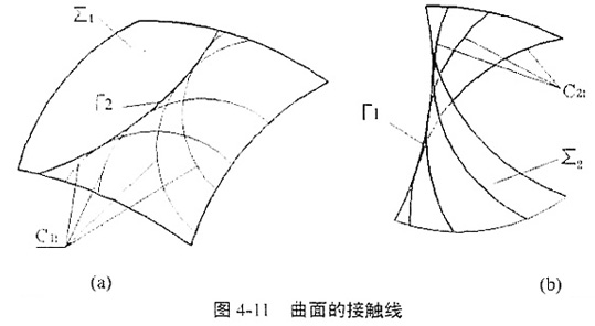無論是已知曲面上的C1t還是共軛曲面上的C2t,當t取不同的值時,就得到不同位置的曲線,也就是說,{C1t}、{C2t}是以t為參數的曲線族,那么在曲面Σ1或Σ2上就可能存在曲線族{C1t}、{C2t}的包絡線。在已知曲面Σ1上,如果曲面族{C1t}存在包絡,那么以包絡線為界可以把Σ1分成兩部分(如圖4-11a所示),一部分布滿了接觸線C1t,一部分則沒有,這條包絡線Γ2稱為二界包絡曲線,其上的各點稱為二類界限點,也稱為嚙合界限點;對于共軛曲面Σ2,因為Σ2全部是由{C2t}組成的,所以如果曲線族{C2t}的包絡存在,則此包絡也就是曲面Σ2的脊線(如圖4-11b所示),這條包絡線Γ1稱為一界包絡曲線,其上的各點稱為一類界限點,也稱為根切界限點或曲率干涉界限點。嚙合界限點可用于判斷已知曲面上有效的嚙合區域,根切界限點可用于避免共軛曲面的根切,這兩類界限點對于共軛曲面的求解有著重要的意義,同時也是評價共軛運動質量的重要指標之一。