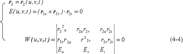為了使上述向量方程變為標量方程,使等式兩端點積以r2u×r2v(≠0),并按拉格朗日恒等式展開,整理后得