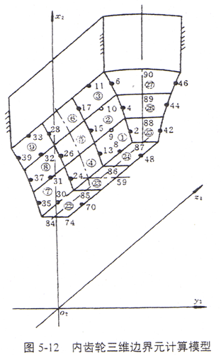 基于上述接觸問題的有限元與邊界元計算模型和前面的載荷分析,對一模數m=5mm、齒數Z=40、分度圓壓力角a=20°、分度圓直徑d=200mm、齒寬b=20mm、齒輪材料的彈性常數E=2.1×105N/mm2、泊松比μ=0.3、傳遞扭矩Mn=300N·m的共軛鼓形齒聯軸器鼓形齒輪Ⅰ進行了接觸應力計算,其簡圖如圖5-9所示。該問題接觸應力的有限元與邊界元數值解和接觸應力分布曲線分別如表5-1、圖5-10所示。曲線①(虛線)為接觸應力的有限元解;曲線②(實線)為接觸應力的邊界元解。