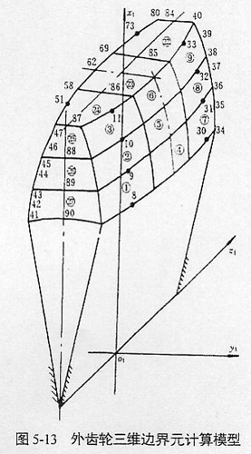 對共軛鼓形齒輪用邊界元法進行接觸問題的研究與分析時,首先只需對邊界即齒廓表面進行單元劃分,然后對每個嚙合點即接觸區進行局部細分,不需像有限元法那樣,需從表到里將整個齒輪輪齒進行劃分。