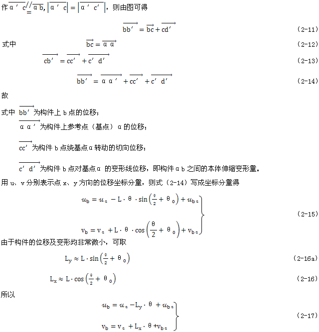 式(2-17)就是構件上任意兩點的位移協(xié)調(diào)原理,其意義為構件在外力作用下,產(chǎn)生微小剛體位移和彈性變形位移時,其上某點的位移是所選參考點的位移(平動位移)、與該點繞參考點轉動的角位移以及與考慮點之間的相對變形位移的合位移。