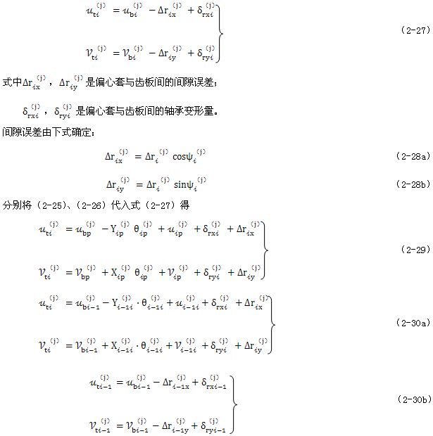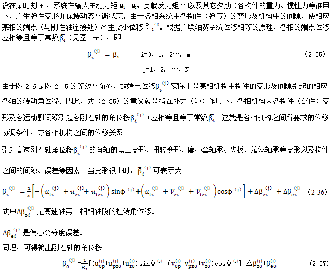 式(2-40)就是少齒差連桿行星齒輪傳動初喲多齒接觸承載的位移協(xié)調(diào)條件。用于多相并列少齒差連桿行星齒輪傳動機構時,由此消去C(j)后可列出Σni=1(Z(j)-1)個補充方程。