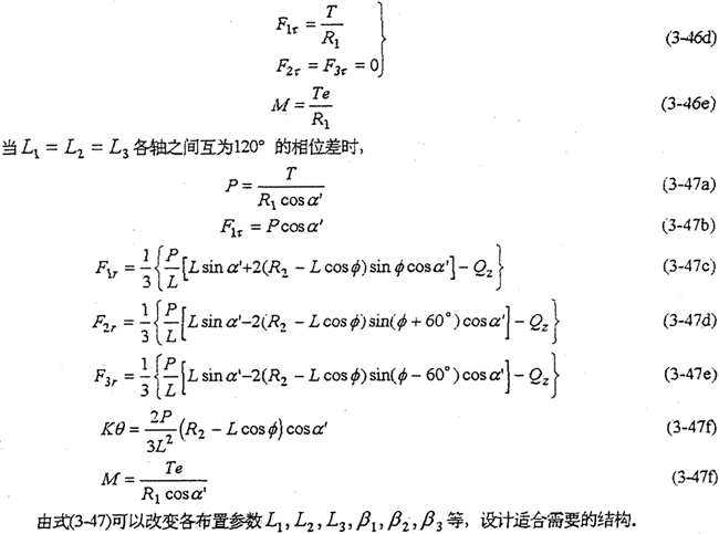 由方程式(3-15)~(3-19)和(3-20)可以完全確定雙軸輸入式的一齒環內齒行星傳動機構的動力參數。各動力參數中除嚙合力只與負載大小有關外,其余載荷均與傳動機構的幾何參數L1,L2,β1,β2,R1,R2,α′,α″等因素有關。故可以通過調整這些參數,以達到滿足結構、載荷要求。