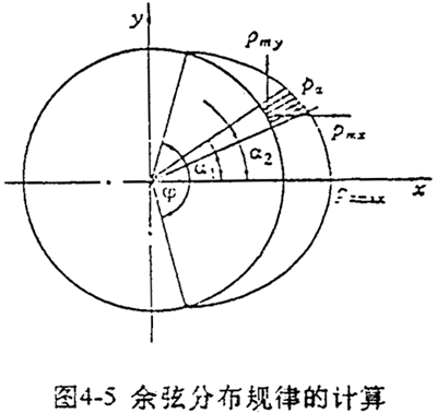 確定作用于結(jié)構(gòu)邊界上的非均布載荷是一件復(fù)雜工作,往往需要進(jìn)行一些較復(fù)雜的計(jì)算,譬如采用接觸問(wèn)題有限元法進(jìn)行計(jì)算。在實(shí)際應(yīng)用中常采用一些近似的假設(shè)規(guī)律來(lái)代替這些復(fù)雜的未知分布規(guī)律。對(duì)于軸承載荷,一般假設(shè)沿周邊按余弦規(guī)律分布如圖4-5所示,即