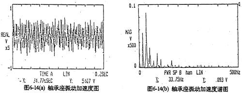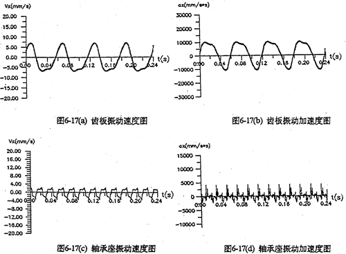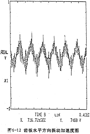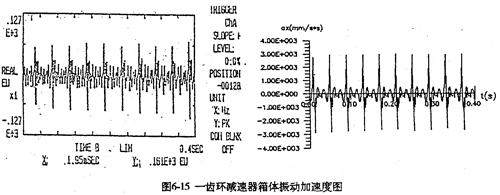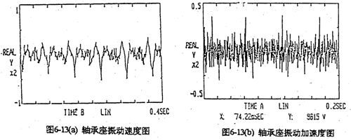 由于每片齒板都存在同樣的周期性激勵沖擊函數,相位差120°,迭加后的總效果仍然是轉頻周期函數。因此對箱體軸承座的沖擊也呈周期性。圖6-13是支承軸箱體軸承座的振動速度及加速度的實測時域曲線圖。其曲線圖的變化規律及幅值與圖6-4完全接近。速度及速度沖擊值為v