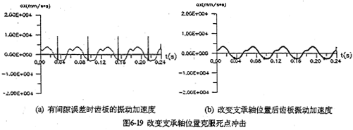 采用雙軸輸人的齒板及箱體軸承座振動速度、加速度如圖6-17所示。從圖看出齒板速度及加速度值明顯變小(為單軸輸人時的0.3倍),而且無沖擊,完全屬于穩太振動。箱體的振動速度及加速度幅值只是單軸輸人時的0.2倍。圖6-18a是一軸的偏心套存在0.05度的分度誤差時齒板的加速度曲線圖,圖中明顯出現加速度沖擊棒線。采用雙軸輸入后,死點沖擊被徹底(見圖6-18b) , 變成穩態振動曲線了。因此,為了減小三環減速器的振動,有必要加大三環減速器的橫向尺寸,在箱體內增加一套雙軸輸入的齒輪功率分流機構,或者在箱體外另設計一套功率分流機構,以解決機構過死點的振動問題。
