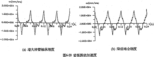 增大行星軸承剛度的目的在于減小雙曲柄機構的變形,降低死點沖擊幅值。并且使各相嚙合力均衡化、減小嚙合沖擊。圖6-20是分別將行星軸承剛度增加一個數量級和內齒圈降低一個數量級時齒板的振動加速度。兩者加速度幅值均降低了1/4倍左右。